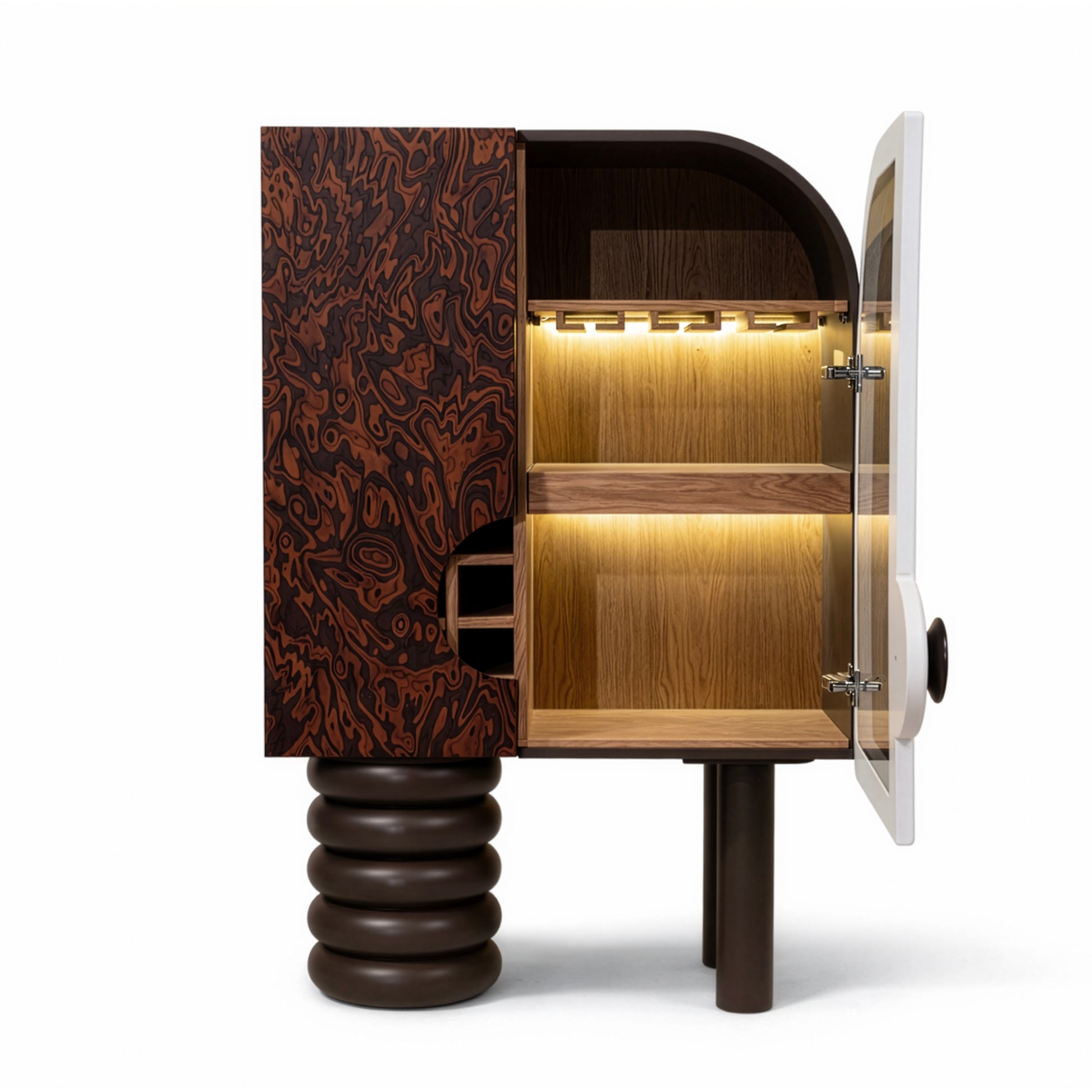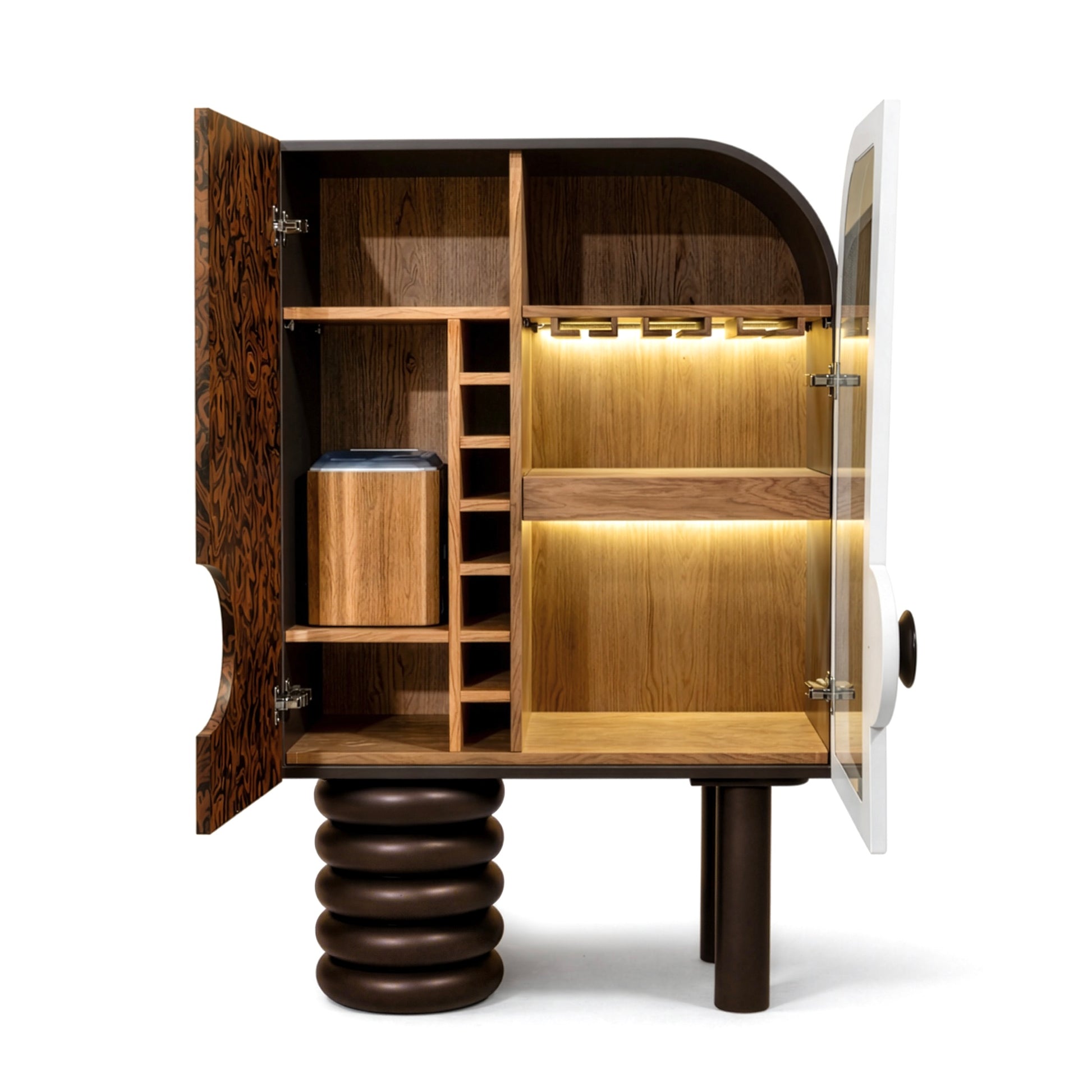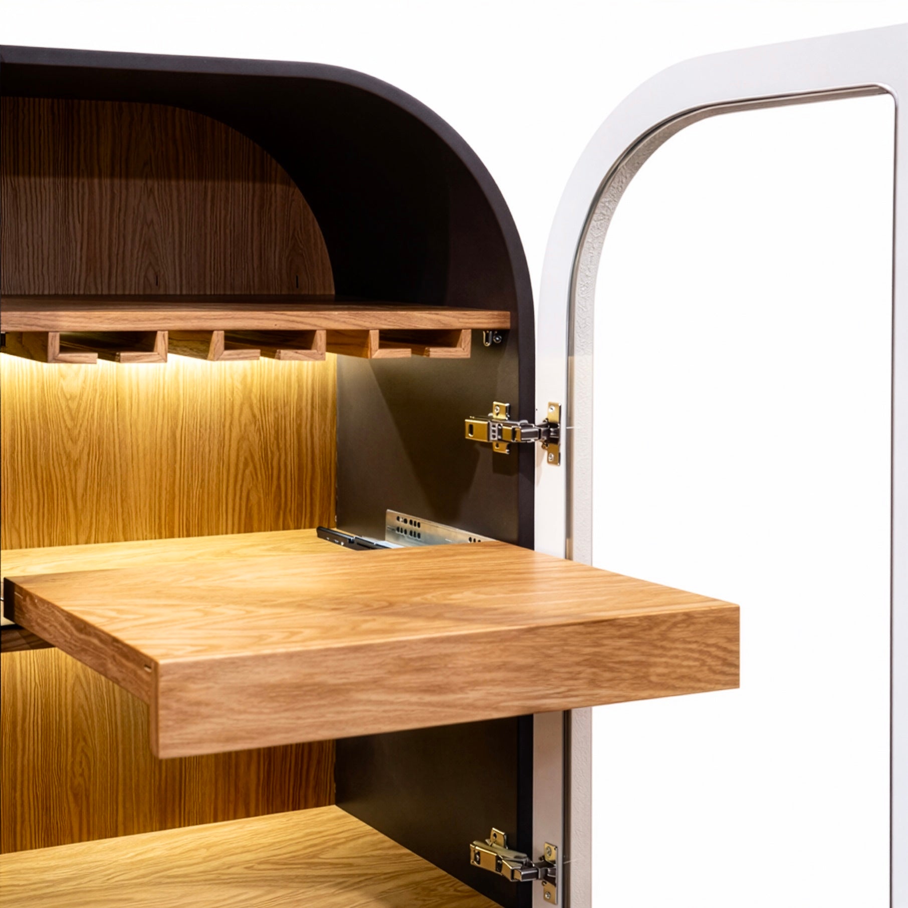 İç bölümde entegre buz makinesi, LED aydınlatmalı raf sistemi, kadehlik ve sürgülü servis tablası yer alır. Katmanlı iç mimari kurgusu sayesinde hem bar ünitesi hem de prestijli bir servis alanı olarak kullanılabilir. Aydınlatma detayları, iç hacimde derinlik ve atmosfer oluşturarak ürünü fonksiyonun ötesine taşır.