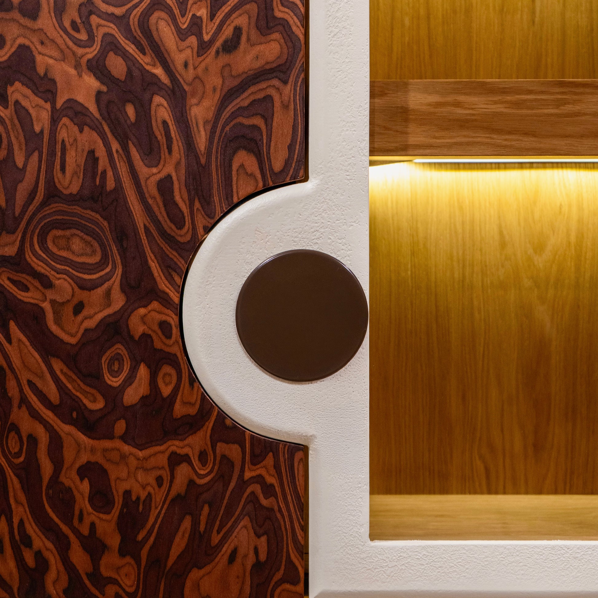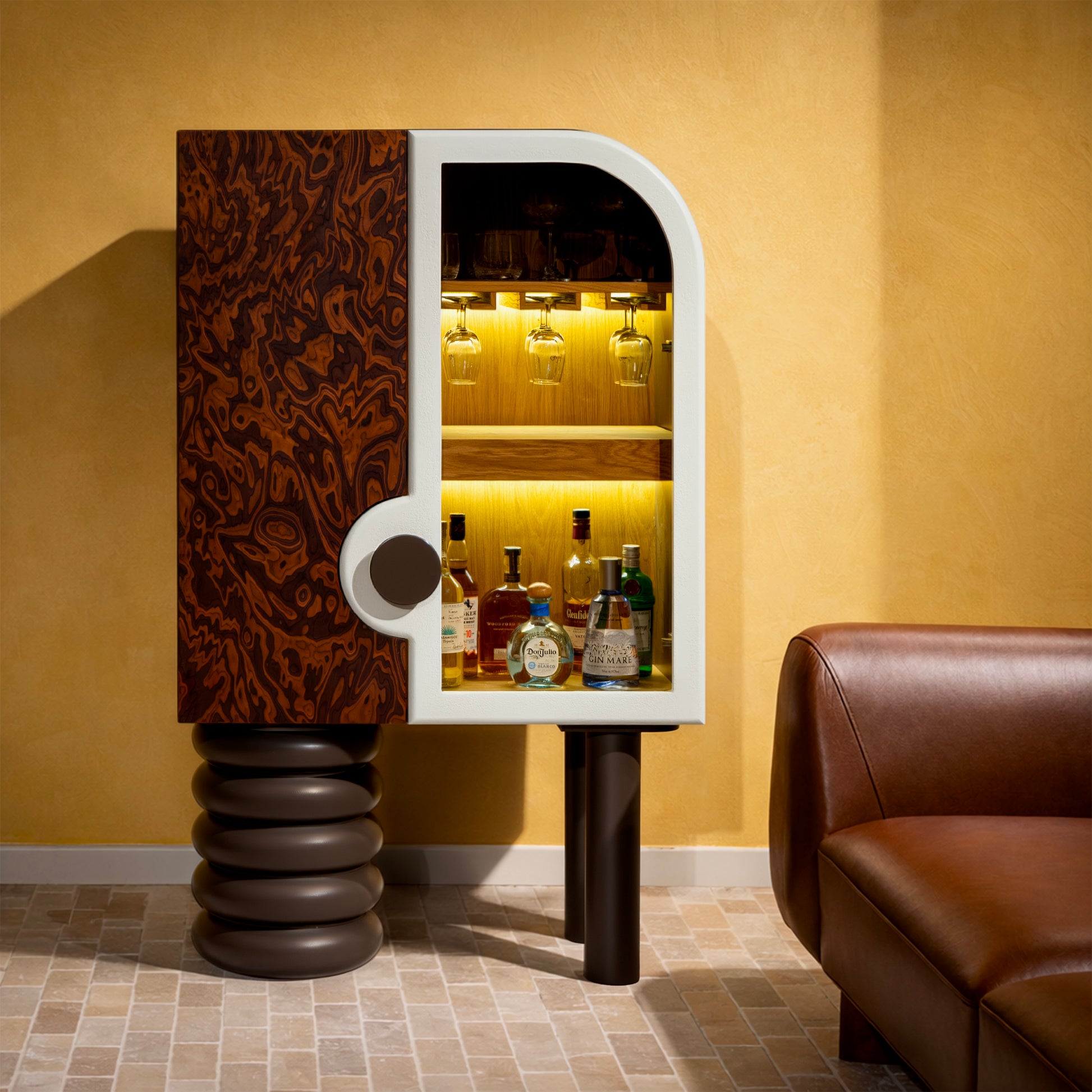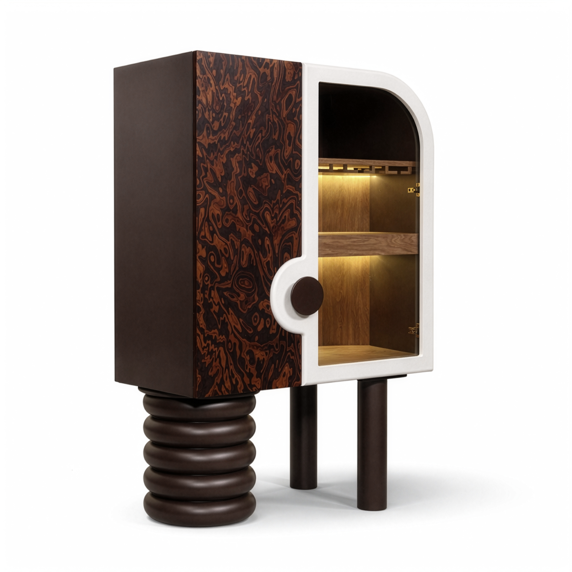 İç bölümde entegre buz makinesi, LED aydınlatmalı raf sistemi, kadehlik ve sürgülü servis tablası yer alır. Katmanlı iç mimari kurgusu sayesinde hem bar ünitesi hem de prestijli bir servis alanı olarak kullanılabilir. Aydınlatma detayları, iç hacimde derinlik ve atmosfer oluşturarak ürünü fonksiyonun ötesine taşır.
